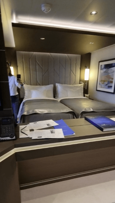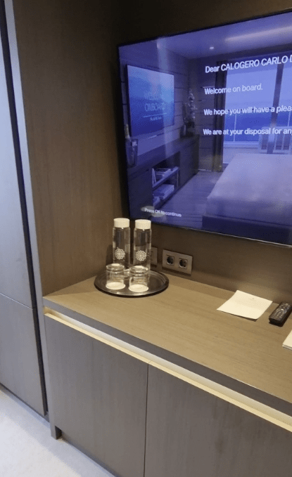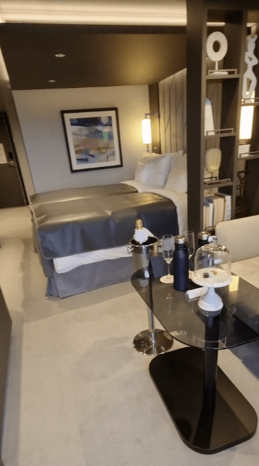 La Suite vanta anche di una consolle con TV interattiva, binocolo e una dispensa con caffettiera, theiera con diverse miscele di te e cialde per il caffè.